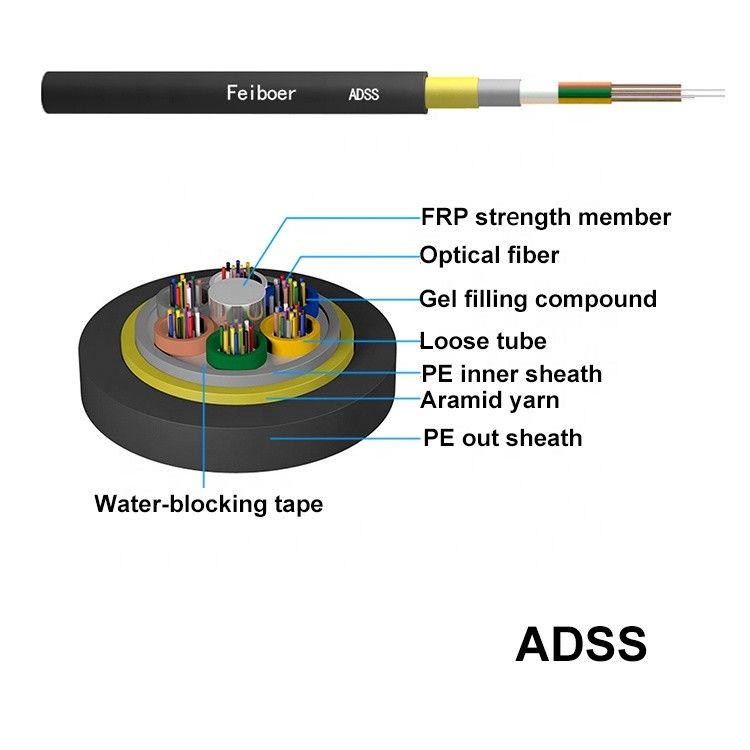 สาย ADSS เป็นท่อแบบหลวม ๆใยแก้วนำแสง 250m ท่อหลวมทำจากพลาสติกโมดูลัสสูงซึ่งเต็มไปด้วยสารประกอบกันน้ำตรงกลางของแกนสายเคเบิลเป็นส่วนที่มีความแข็งแรงของ FRP ท่อหลวม (และเชือกเติม) จะถูกบิดรอบแกนเสริมกลางเพื่อสร้างแกนสายเคเบิลขนาดกะทัดรัดและกลมและช่องว่างในแกนสายเคเบิลจะเต็มไปด้วยน้ำ การปิดกั้นฟิลเลอร์ด้านนอกของสายเคเบิลเป็นปลอกด้านในโพลีเอทิลีน (PE) จากนั้นบิดอะรามิดที่มีความต้านทานแรงดึงสูงด้านนอกสุดคือปลอกด้านนอกแบบติดตามไฟฟ้า (AT)